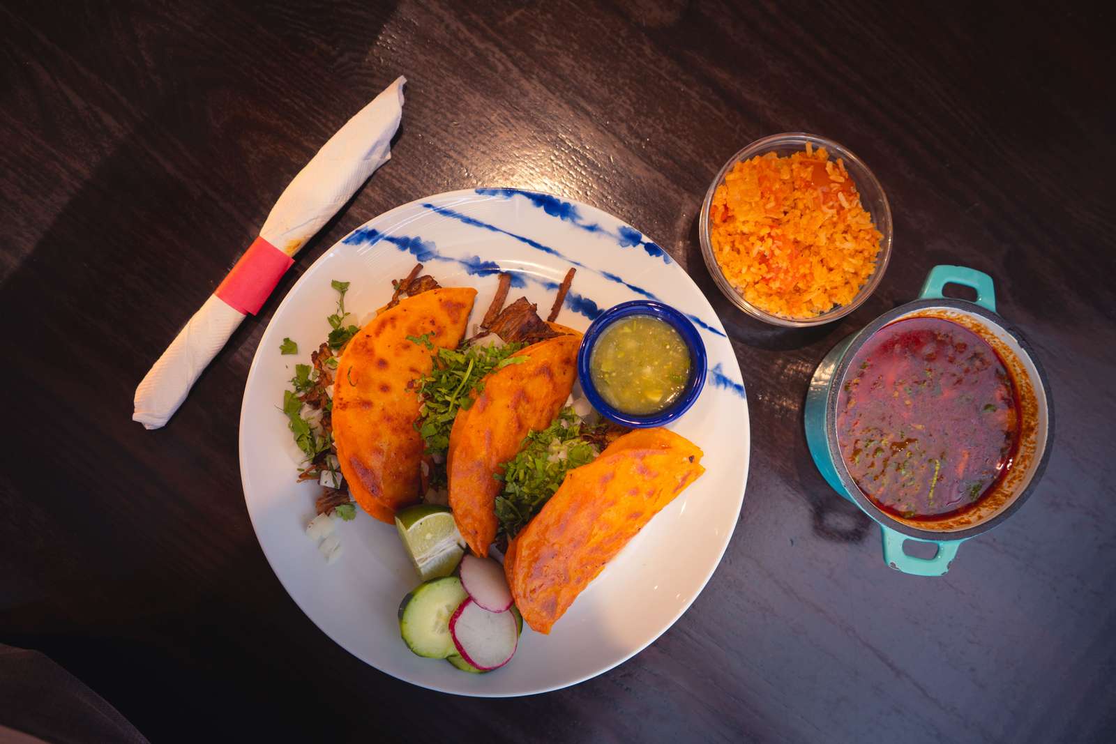 3 Traditional beef birria tacos with mexican cheese, onions, cilantro, consome, salsa and rice on side.